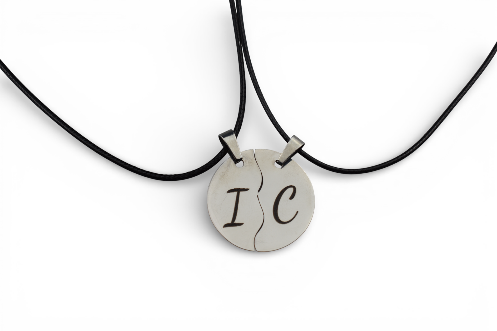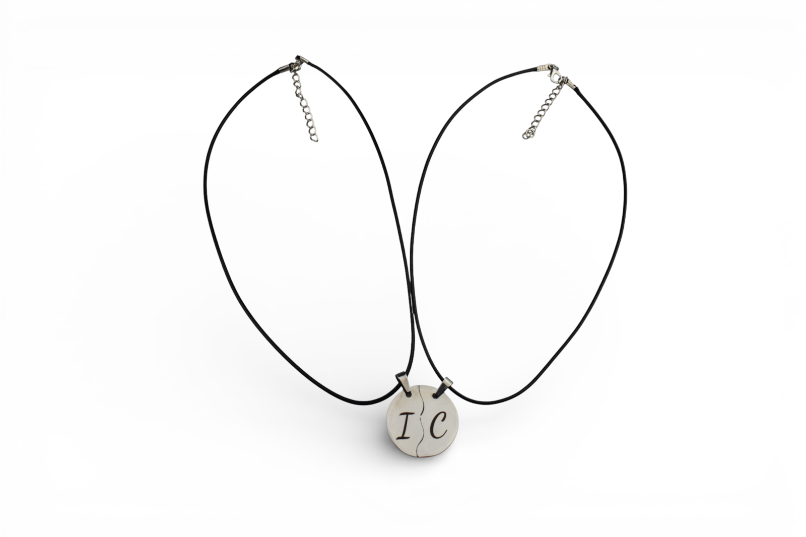 Acest set este format din două lanțuri separate, fiecare cu un pandantiv complementar. Împreună, pandantivele se completează vizual și formează un cerc complet, oferind un design minimalist și ușor de purtat zilnic. Setul este potrivit ca accesoriu simbolic pentru cupluri sau persoane apropiate și poate fi oferit cadou la ocazii speciale.