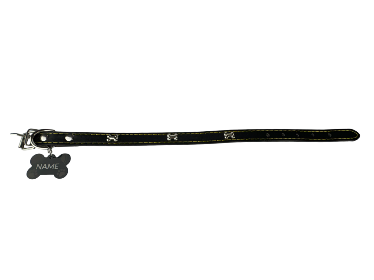 Rasfata-ti patrupedul cu o zgarda stilata si practica! Aceasta zgarda este prevazuta cu o medalie in forma de os cu urechiuse adorabile, pe care gravam numele catelului sau pisicii tale, precum si numarul tau de contact, pentru siguranta.