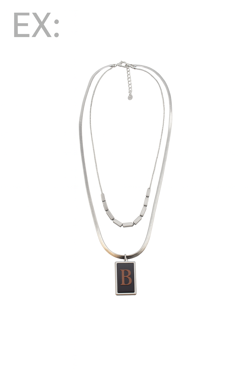 Acest colier elegant "Duo Stratificat Urban" este accesoriul perfect pentru a adăuga o notă modernă și sofisticată oricărei ținute. Confecționat din metal de calitate, prezintă două lanțuri delicate, dar distincte. Cel mai lung este ornat cu un pandantiv dreptunghiular negru mat, ce oferă un contrast urban, în timp ce celălalt lanț adaugă o textură subtilă. Ideal pentru un look contemporan și versatil!