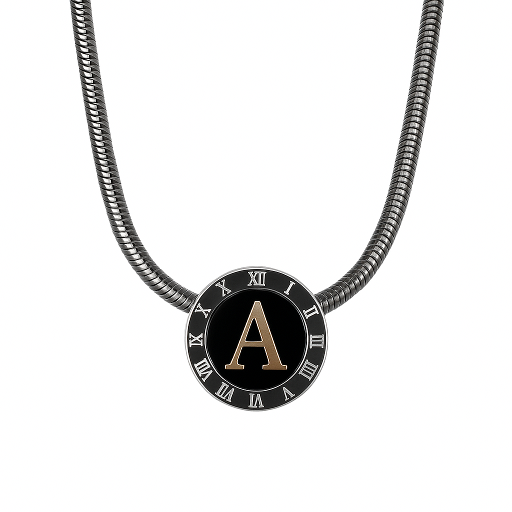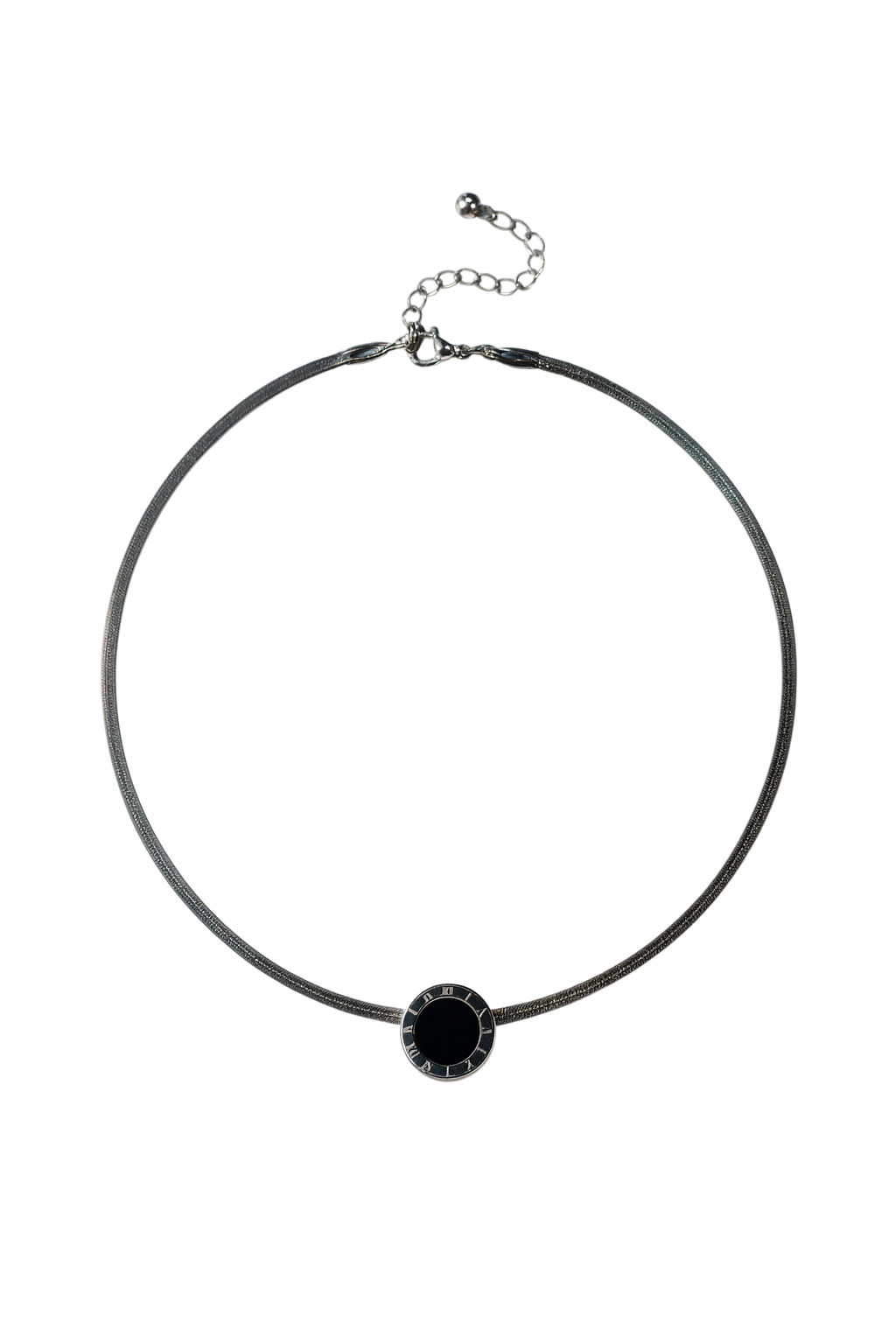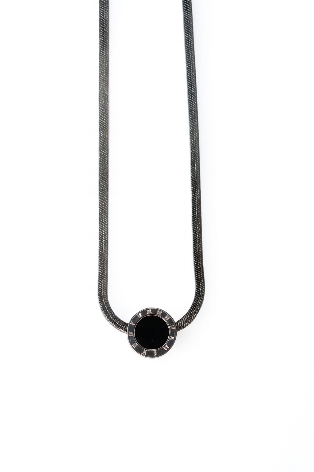 Eleganță și mister se împletesc în acest colier minimalist. Lanțul fin, cu un luciu discret, susține un pandantiv rotund, negru, profund, care adaugă o notă sofisticată oricărei ținute.