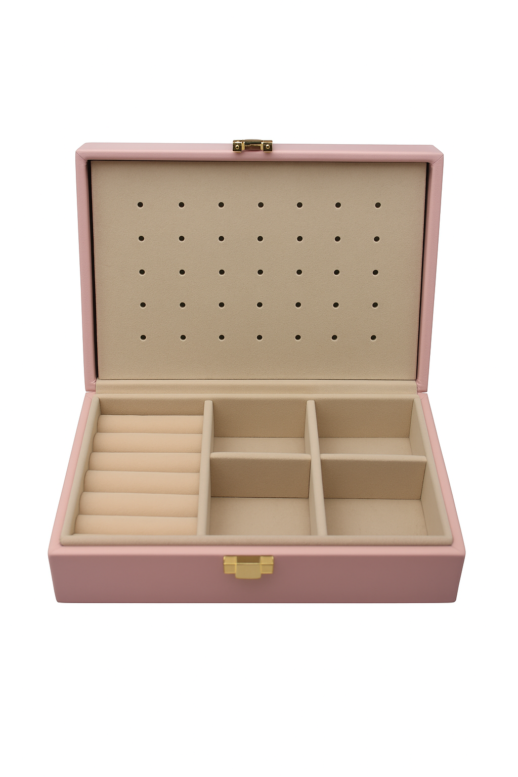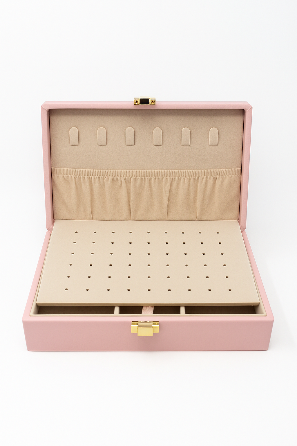 Păstrează-ți colecția de bijuterii în ordine și în siguranță cu această cutie elegantă „Sweet Elegance”. Exteriorul din piele ecologică de un roz delicat și finisajele aurii ale închizătorii adaugă o notă de rafinament. Interiorul este spațios și inteligent compartimentat, oferind spații dedicate pentru inele, cercei (cu suport perforat pentru 15-20 de perechi), coliere și brățări, protejându-le de praf și zgârieturi. Este cadoul perfect pentru orice iubitoare de bijuterii!