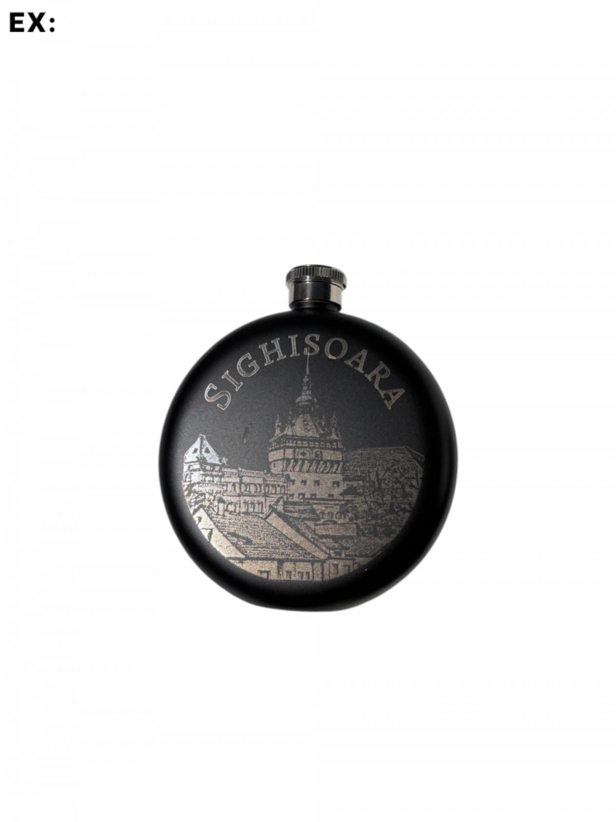 Această ploscă neagră cu finisaj mat este ideală pentru a grava numele cuiva drag, un mesaj scurt sau chiar o imagine simbolică.
